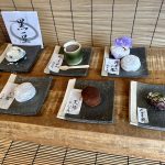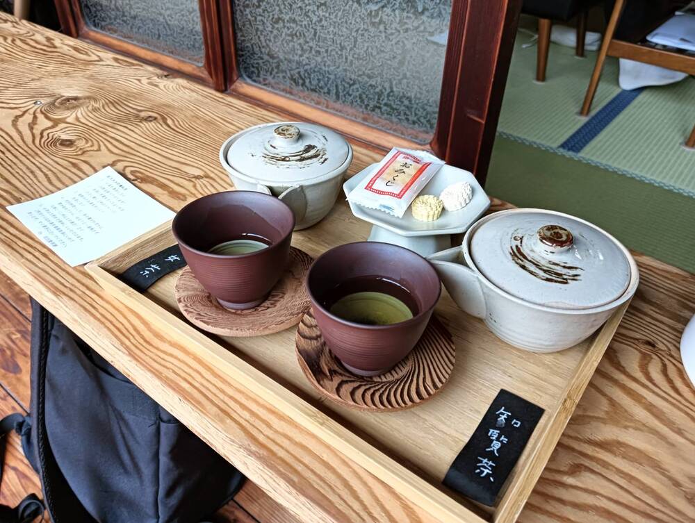 今回選んだお茶は福岡県産の八女茶(やめちゃ)と鹿児島県産の知覧茶(ちらんちゃ)です。注文してしばらくすると、取っ手のない小さな急須と湯呑みを2つずつのせたおぼんが運ばれてきました。