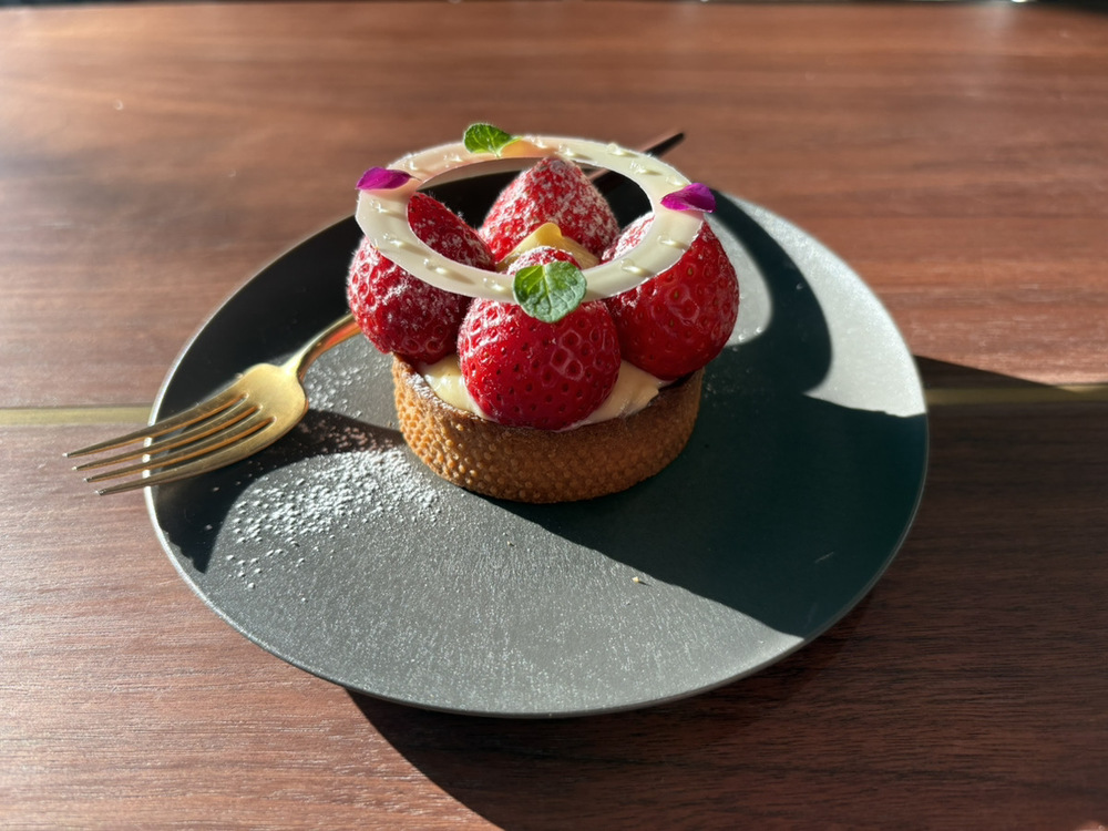 ホワイトチョコレートを使用したいちごタルトは、いちごのほどよい酸味とやさしい甘さ、バターが香る生地が絶妙なバランスで楽しめる一品。とてもおいしかったです。