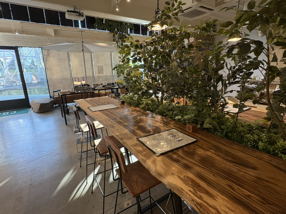 店内に入ると、倉庫ならではの雰囲気を残しつつ、木材や植物がいろいろな場所に取り入れられ、清潔感のある落ち着いた雰囲気が広がっています。