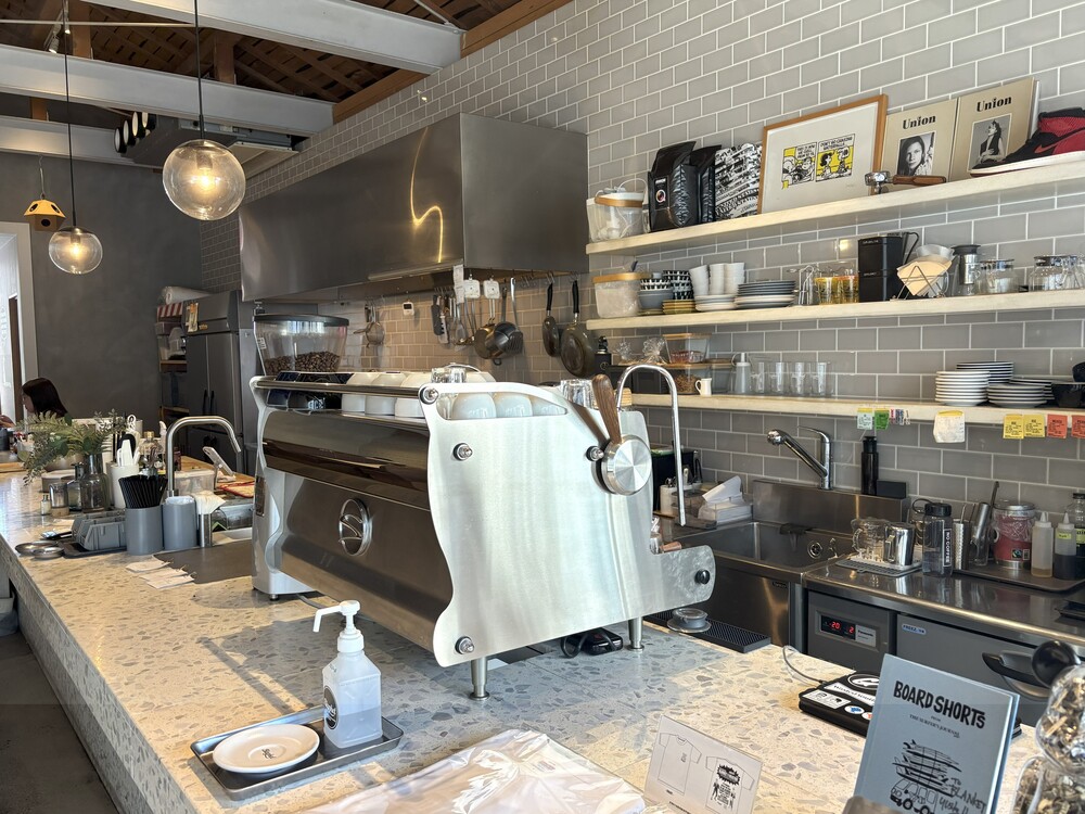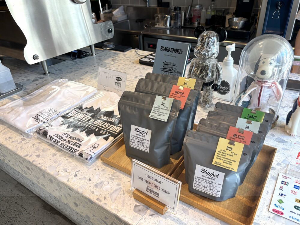 ドリンクはテイクアウトも可能です。レジ前にはコーヒー豆やオリジナルグッズも並んでいした。