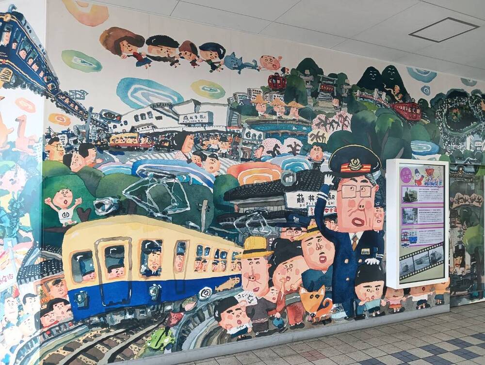 近鉄南大阪線・藤井寺駅の構内には、地元出身のイラストレーターであり絵本作家でもある長谷川義史さんが手がけた壁画があります。これは、藤井寺駅の開業100周年を記念して制作されたもので、地域の人々に親しまれているアート作品です。