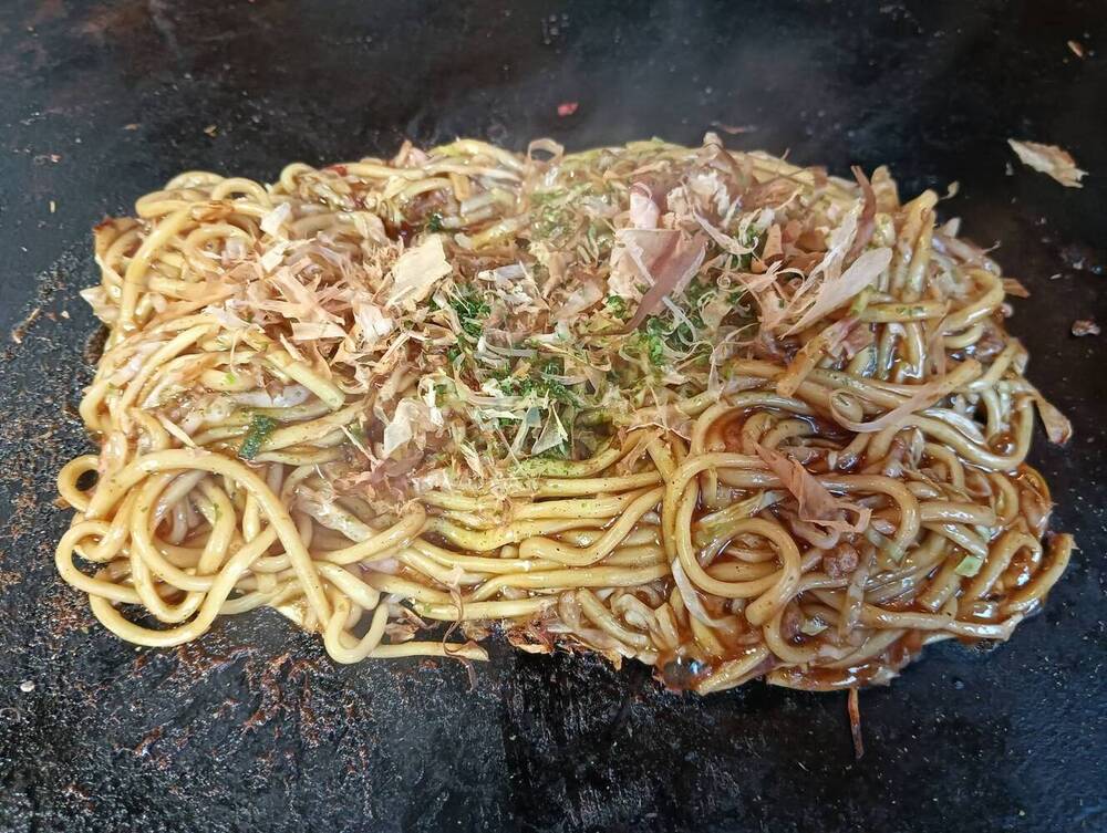 座席には好きなだけ使えるかつお節と青のりが常備されています。焼きたての焼きそばに振りかけると、かつお節が踊り、鉄板に焦げたソースの香ばしい匂いが食欲をかきたてます。