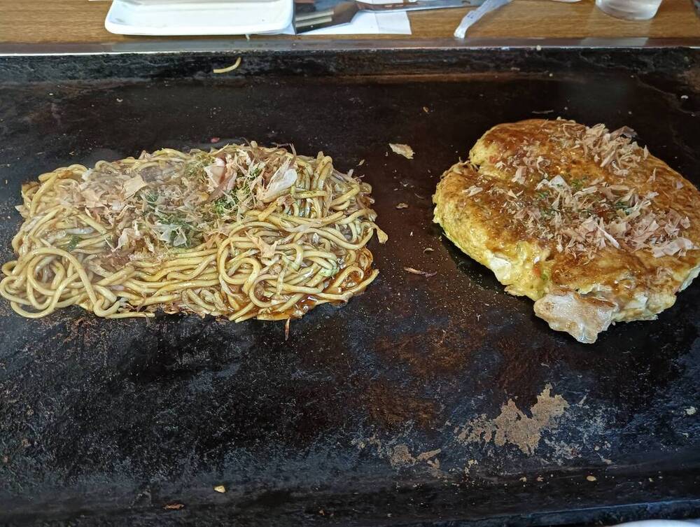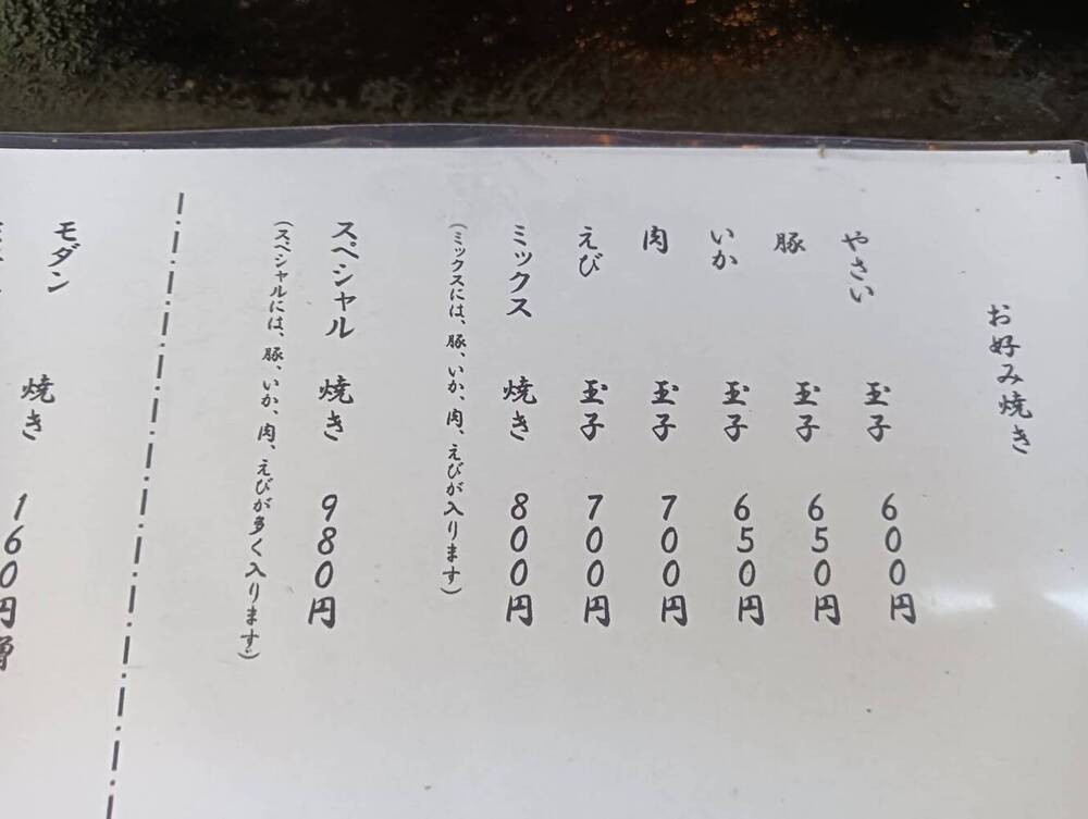 やさい、いか、えび、肉など種類豊富なお好み焼きのなかから、私はミックス焼きと肉焼きそばを注文してみました。