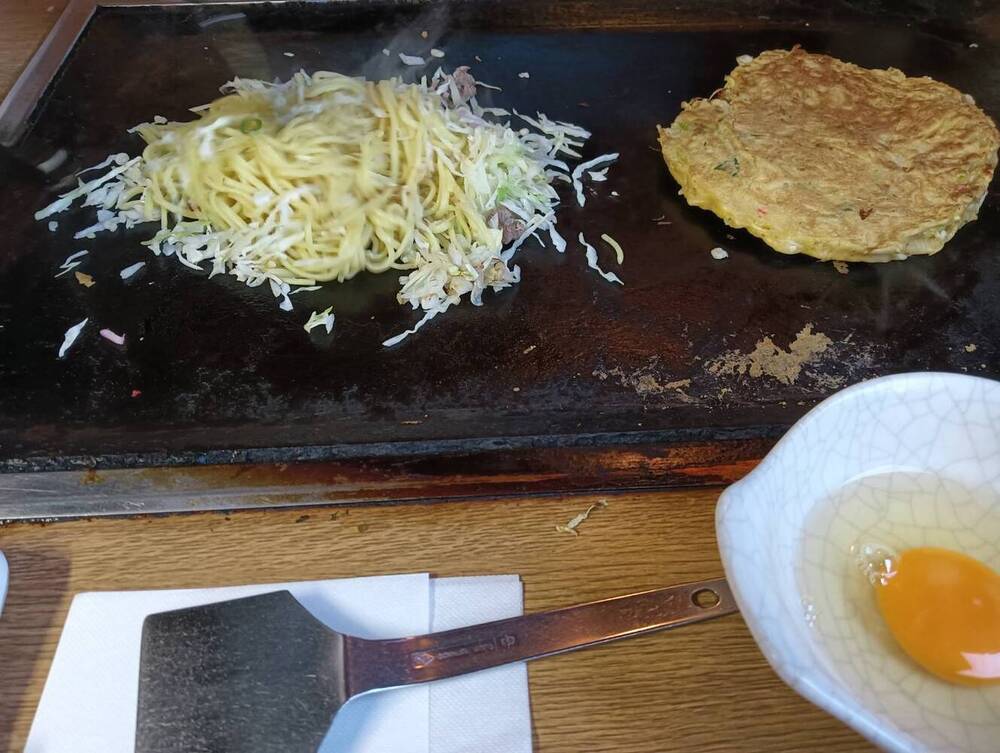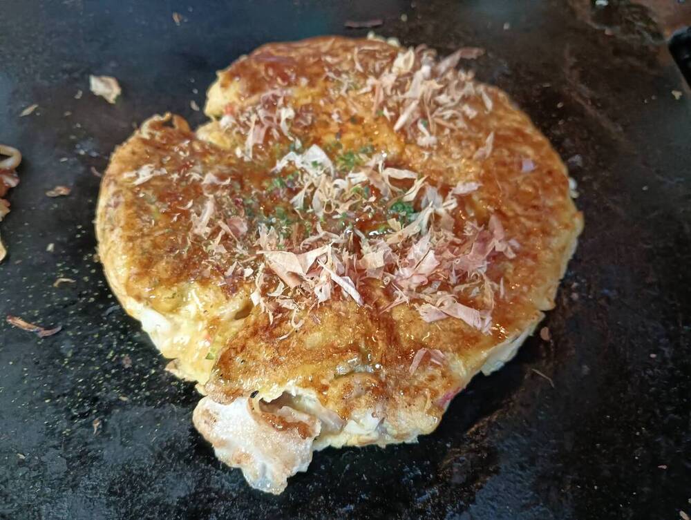 キャベツが控えめで生地が主役のお好み焼きは、もっちりとした食感が特徴。おそらく山芋がふんだんに使われているのではと感じるやさしい口当たりでした。