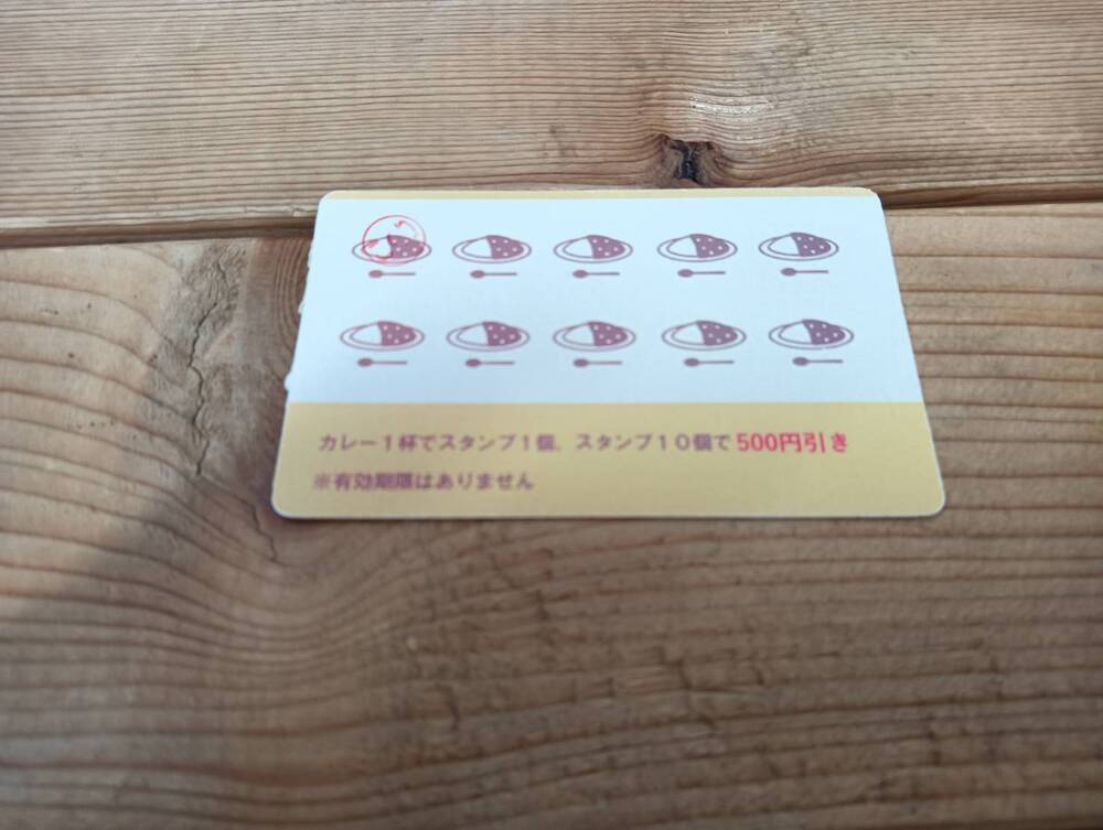 かわいらしいデザインのスタンプカードも用意されていて、カレー1杯につきスタンプを1つ押してもらえます。10個集めると次回のお会計が500円引きになる、うれしい特典です。