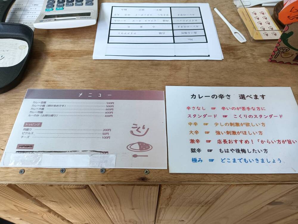 メニューはなんと、カレーの1種類のみ。トッピングの追加や、量を「小盛・並盛・大盛・特盛・ルーのみ(お持ち帰り)」の5段階から選べます。さらに、辛さも7段階から選択可能です。