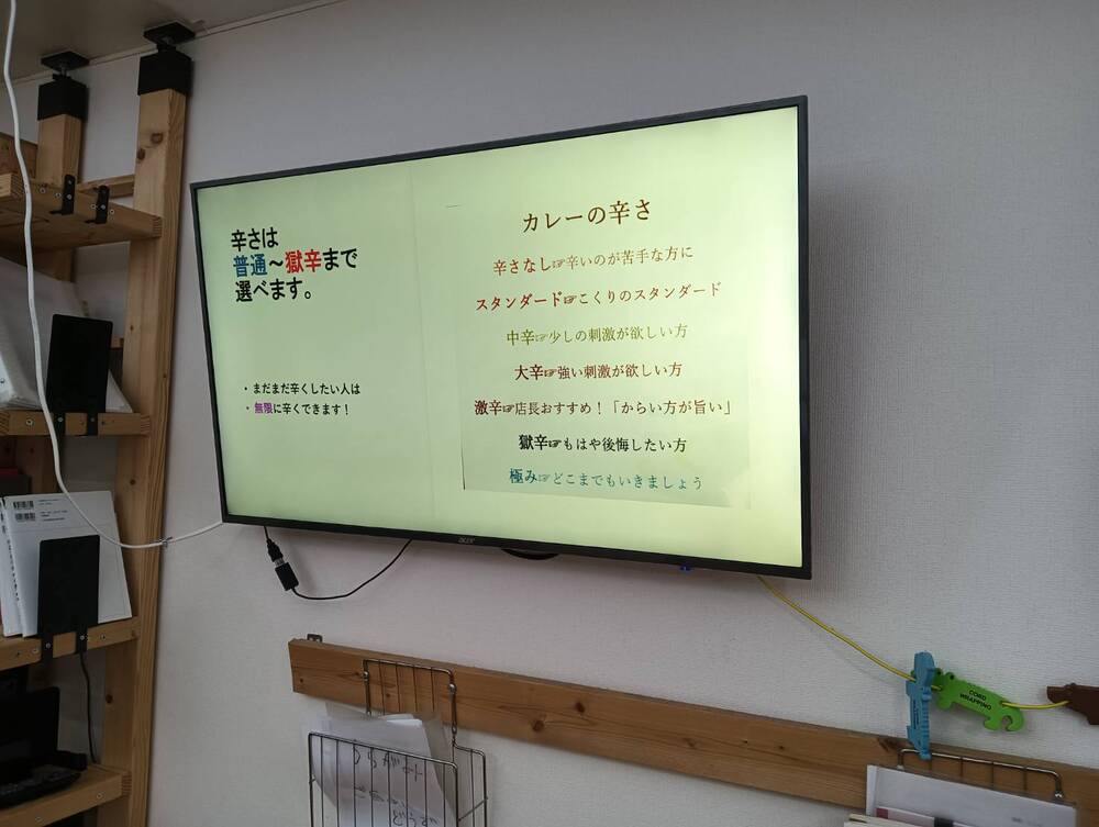 店内にはデジタルサイネージが設置されていて、カレーやトッピングの説明が流れています。