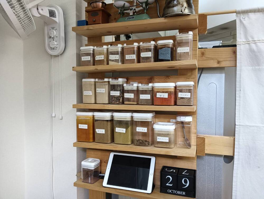 さらに、カレーに使われているスパイスもずらりと並んでいました。改めて数えてみると、スパイスの種類の多さに驚かされます。チリペッパーやローリエ、コリアンダーといった定番のものに加え、マンゴーが使われているのも印象的でした。