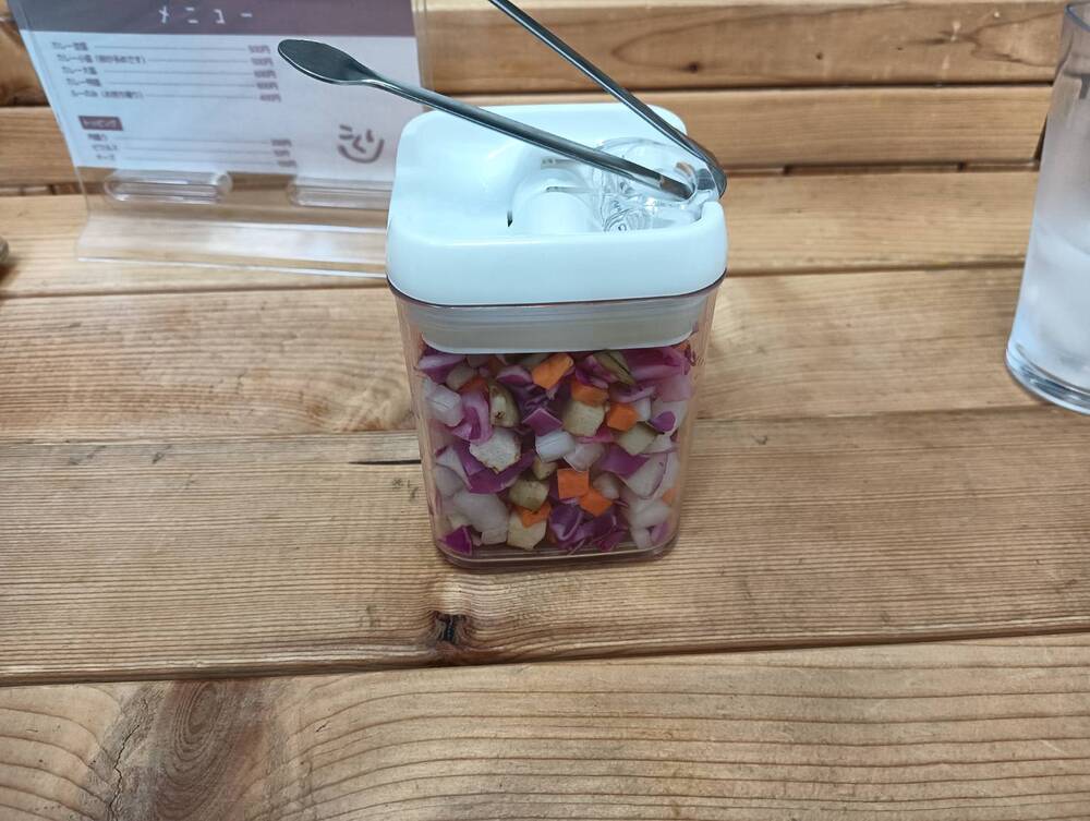 添えられているピクルスは自家製で、週替わりでさまざまな野菜が使われているそうです。今回いただいたのは、ナスや大根、キャベツ、人参などの彩り豊かなピクルス。店内で食事をする場合は、テーブルに置かれた容器から無料でおかわりできるのもうれしいポイントです。