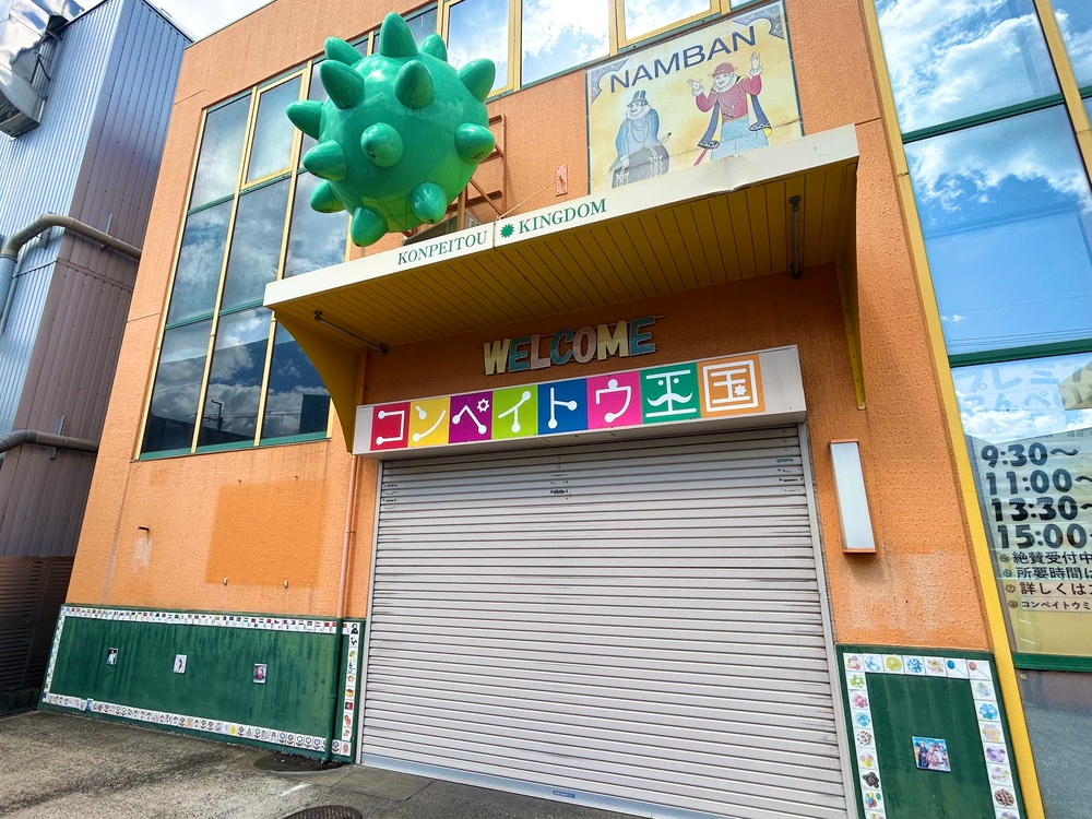 オレンジ色の建物に、「コンペイトウ王国」と書かれているカラフルな看板が目印です。緑色の大きな金平糖のオブジェがとても目立っていました。