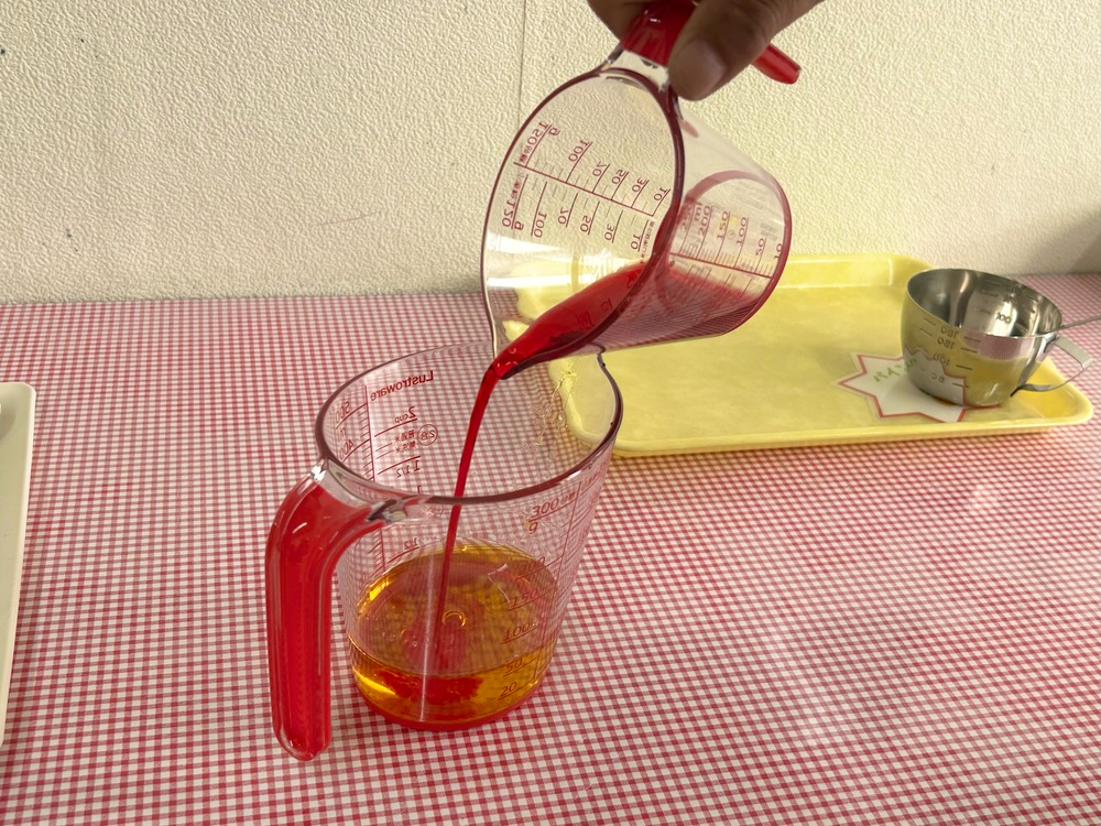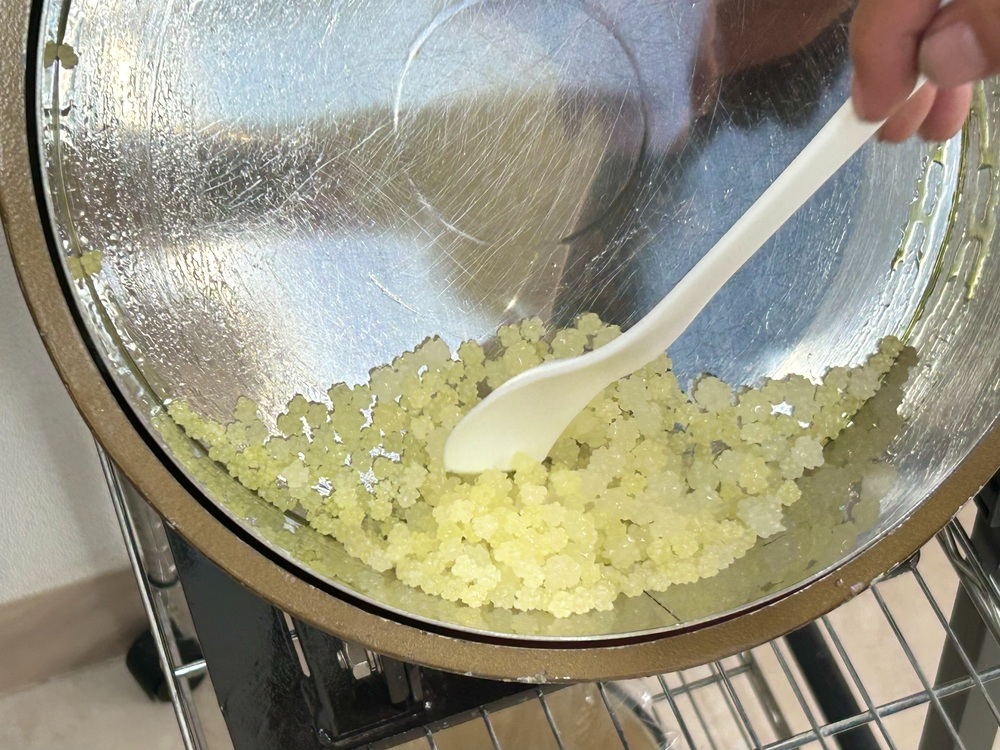 まずは、最初に選んだ黄色の色水を、糖蜜の入った容器に入れていきます。液体を入れる前に味つけ前の金平糖を味見してみると、ほんのりと甘みを感じられました。