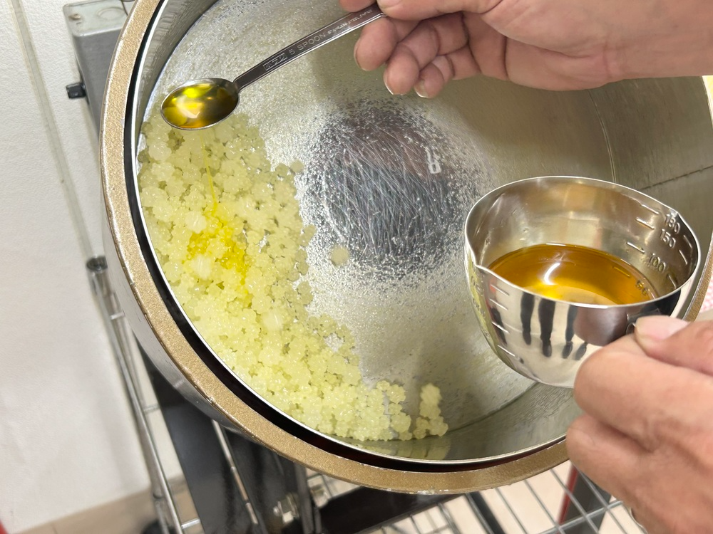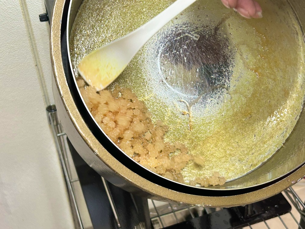 続いて、香料を混ぜた糖蜜を投入。パインのとてもいい香りがただよってきます。