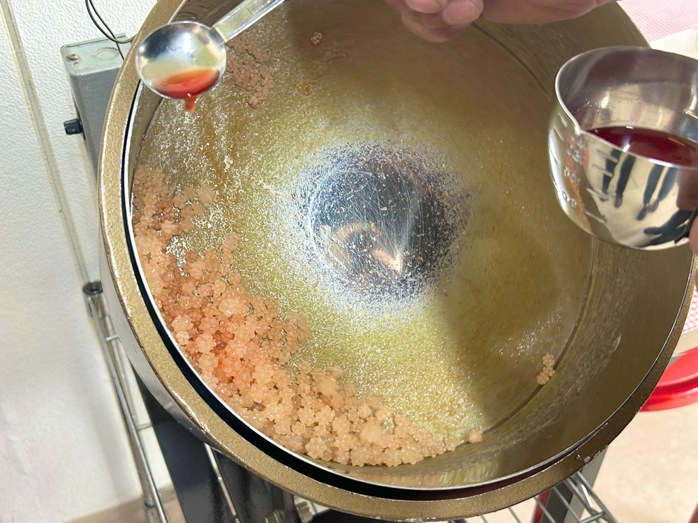 釜に糖蜜を入れた後は、金平糖全体に色が広がるように混ぜていきます。