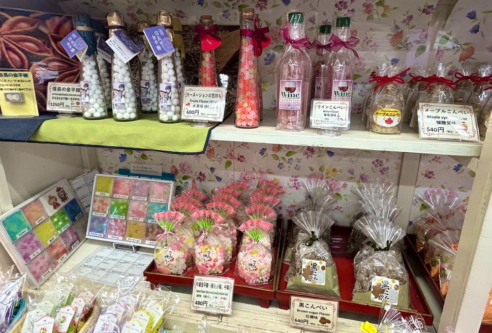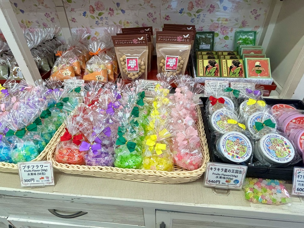 かわいいビンに入った金平糖のほか、ワイン味やメープル味といった珍しい風味など、興味をそそられる商品がたくさんありました。