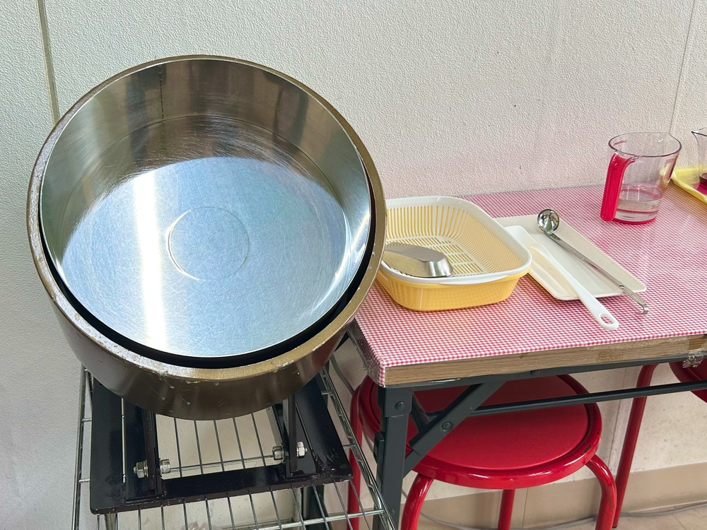 体験では、こちらの釜を使用します。実際に工場で使われているものは、これよりもさらに大きく、直径180センチ、深さは44センチ、重さはなんと800キロにもなるそうです。