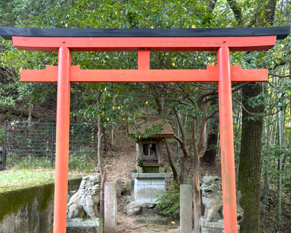 恩智神社とのつながりは定かではなく、建立の時期も不明ですが、池に着くと右手に見える赤い鳥居が目印となり、すぐにその存在に気づきます。