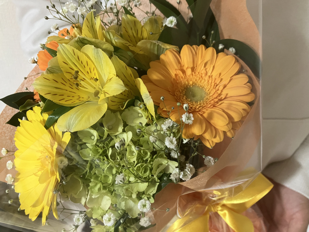 自分で選んだオレンジのガーベラを中心に、華やかに仕上げてくれました。