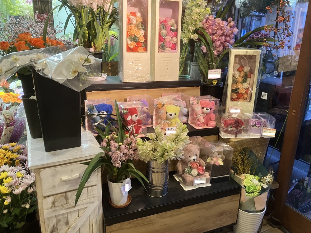 花びらを石鹸素材でつくり、ほのかに石鹸の香りが楽しめるシャボンフラワーのブーケや、かわいらしいくまのぬいぐるみがセットになったブーケなど、豊富な種類が揃っています。